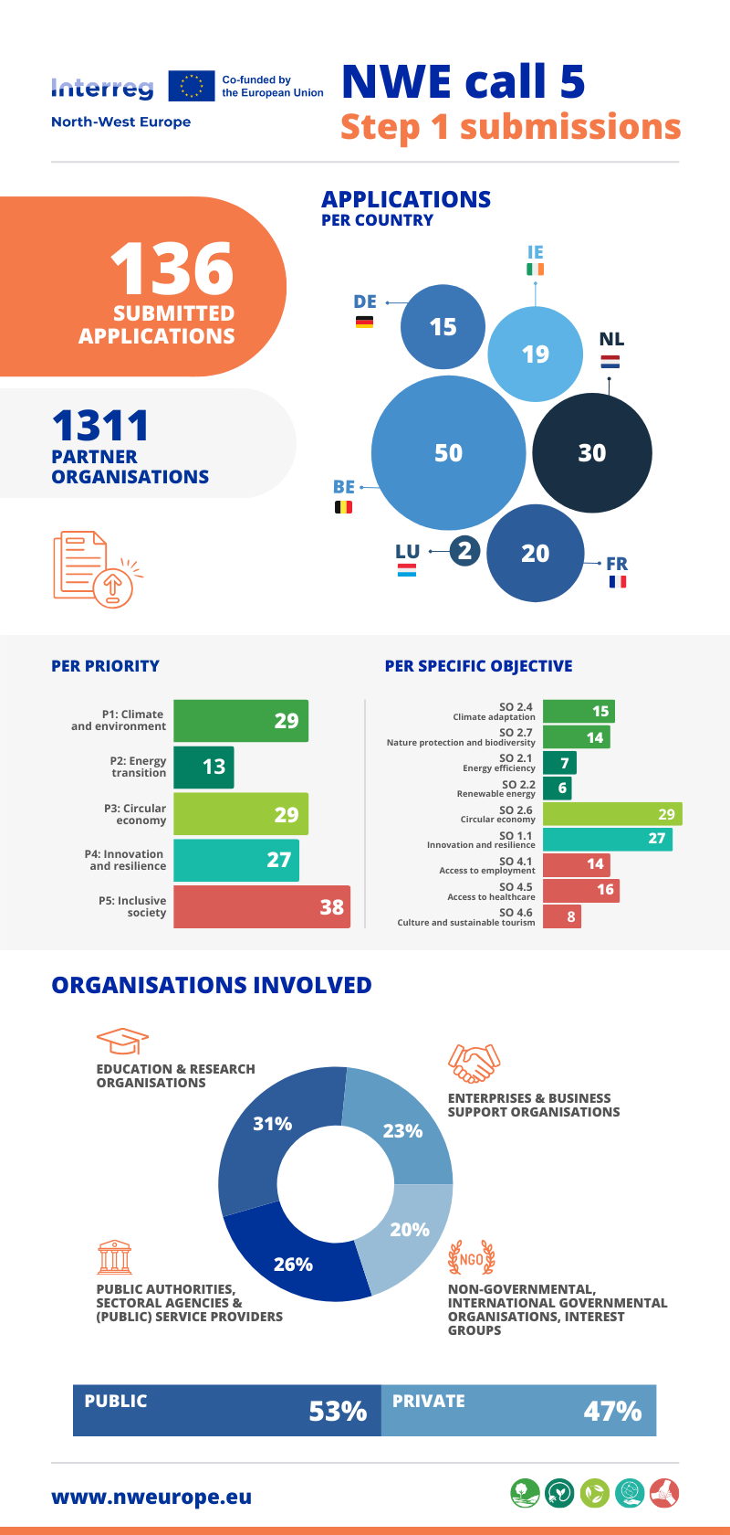 The fifth Interreg NWE call for projects in the 2021-2027 period received 136 proposals after its closure on Thursday, 16 January 2025, at 12:00 noon (CET).