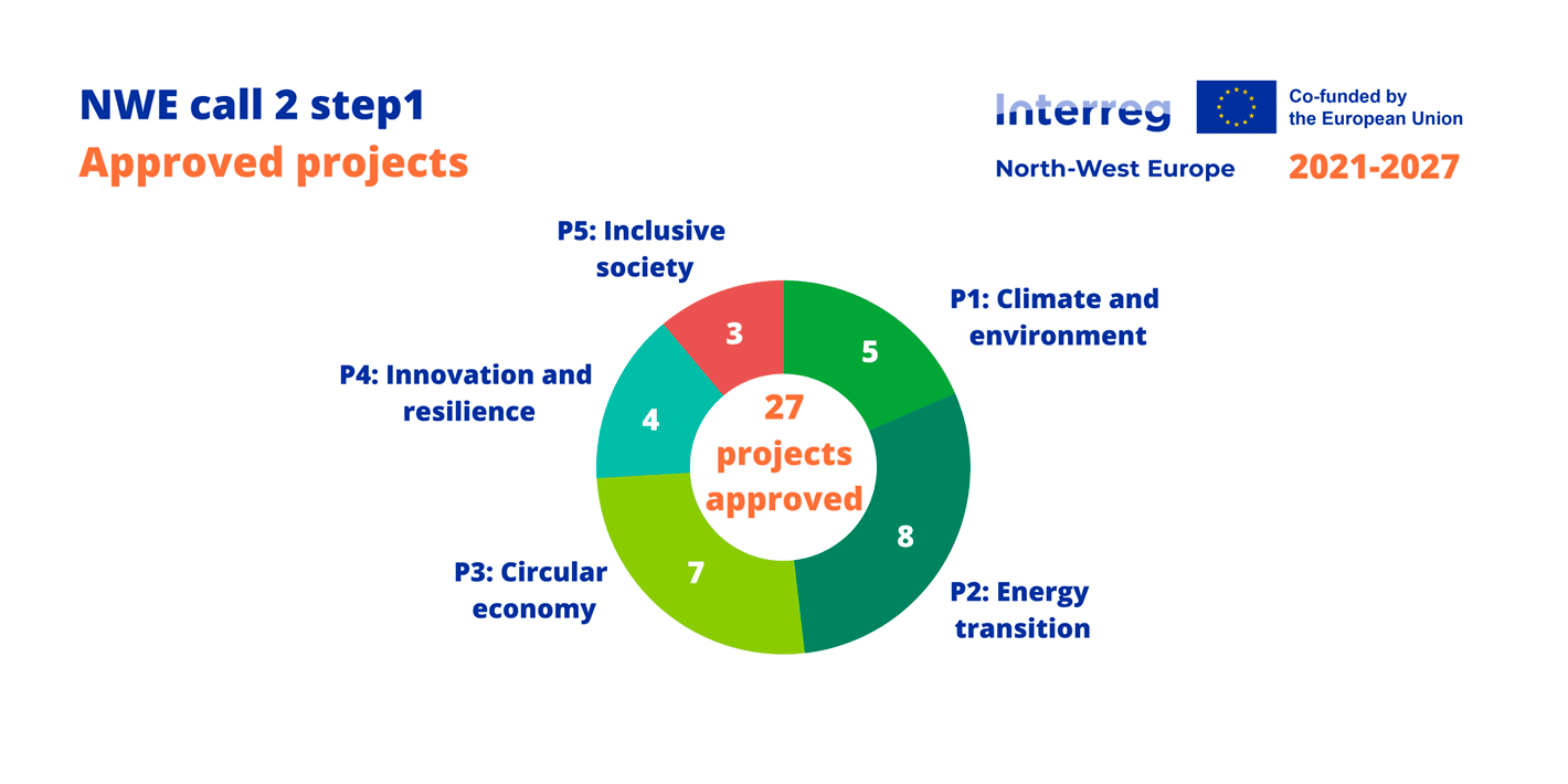 Interreg NWE 2021-2027 Call 2 opened on 14 November 2022 and closed on 9 February 2023. 17 projects were approved in step 2 after the Monitoring Committee meeting on 21-22 November 2023. See below the terms of reference for call 2 and an overview of the call.
